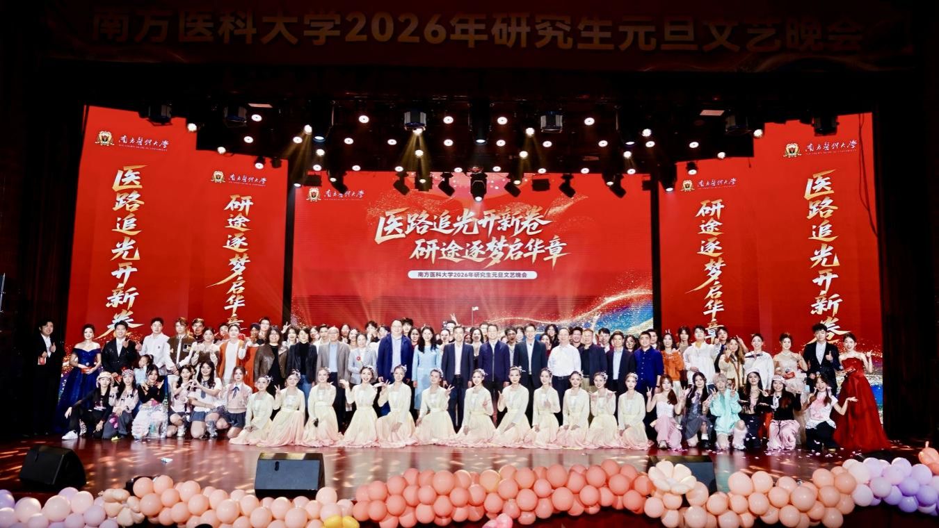 12月19日晚,2026年研究生元旦文艺晚会在校本部大礼堂精彩上演。学校党委常委、副校长杨海文,学校党委常委、副校长王冬,第一临床医学院党委书记蒋鸿,各机关职能部门、研究生培养单位及教辅机构领导、研究生辅导员,华南师范大学、星海音乐学院等高校研究生会代表与 2000余名同学共同欣赏晚会。晚会由研究生院(党委研究生工作部)、校团委主办,校研究生会承办,通过“南方医科大学研究生教育”网络平台同步直播,“线上+线下”近2万人同时观看。