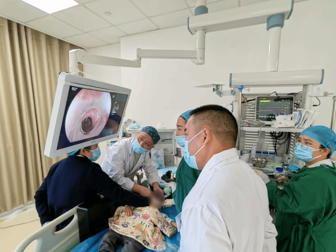 一场精心准备的手术迅速展开。为确保万无一失,正在剑河县人民医院帮扶、挂职消化内科主任的第八附属医院消化内科副主任何顺辉与当地医院的消化内科副主任黄香联合进行手术操作。麻醉科主任陶著则为这名幼小的患者制定了周密的麻醉方案,并全程监护,为手术的成功提供了至关重要的生命支持。