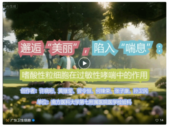在第二届"南山杯"呼吸健康科创·科普大赛全国总决赛中,医学检验科团队创作的科普视频《邂逅"美丽",陷入"喘息":嗜酸性粒细胞在过敏性哮喘中的作用》荣获二等奖。作品以严谨的科学内核与生动的叙事手法,通过动画解析与临床案例结合,将复杂免疫机制转化为通俗易懂的健康知识。