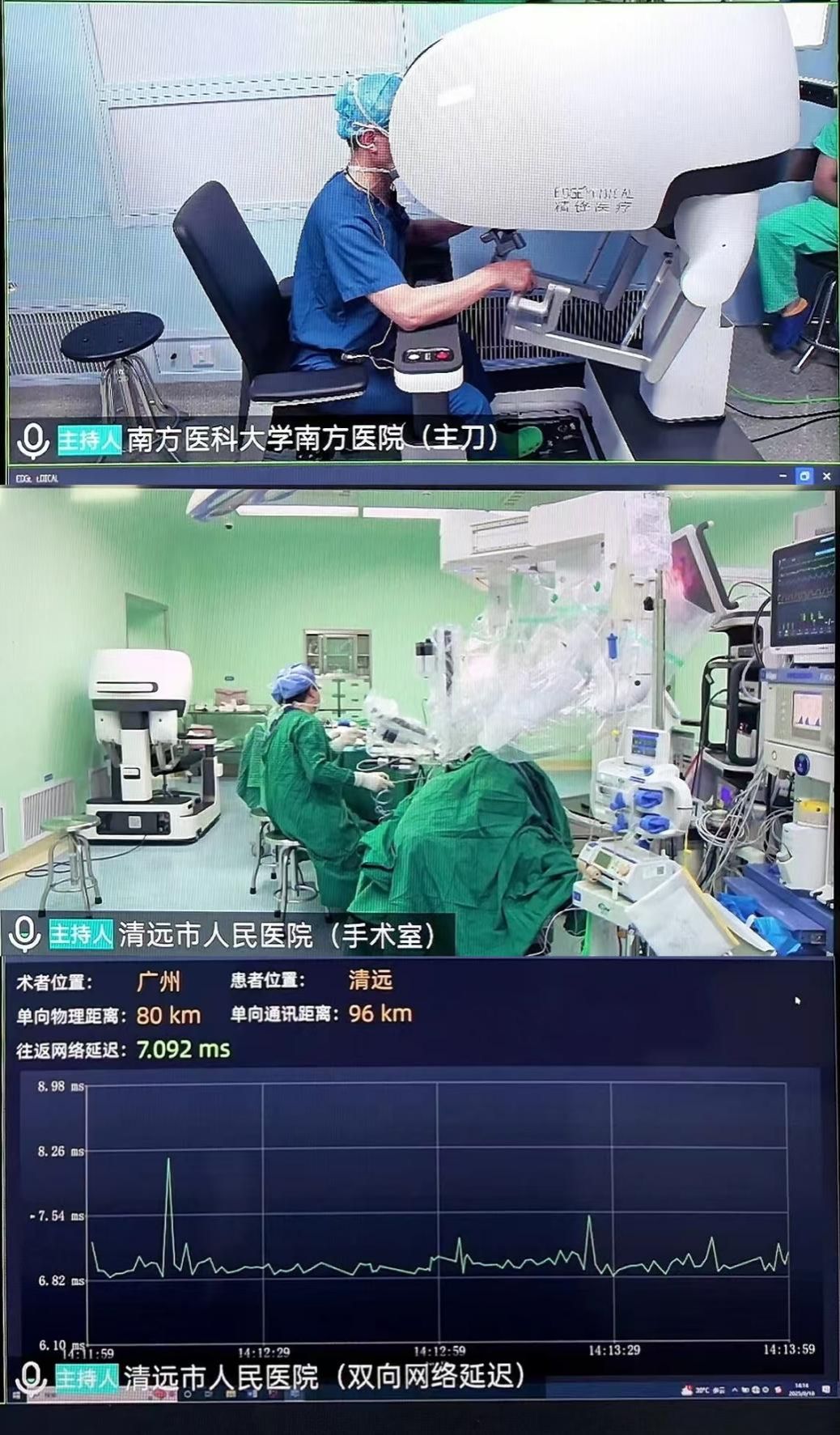 南方医科大学副校长许可慰在南方医院主控室,通过国产机器人系统,为身处清远市人民医院的一位患者成功实施了肾部分切除术。手术需在精准切除肿瘤的同时,最大限度保留肾功能,避免损伤大血管,犹如拆弹,远程操作对稳定性要求极高。