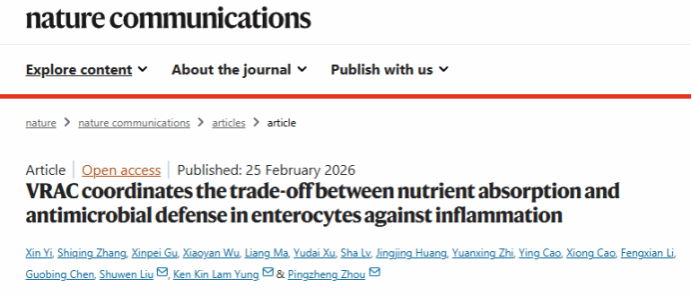 研究成果在Nature Communications发表,题为“VRAC coordinates the trade-off between nutrient absorption and antimicrobial defense in enterocytes against inflammation”,药学院博士后易欣、暨南大学副研究员张世卿、药学院博士生顾心培、吴晓燕为本文共同第一作者,周平正教授、翁建霖教授和刘叔文教授为共同通讯作者。
