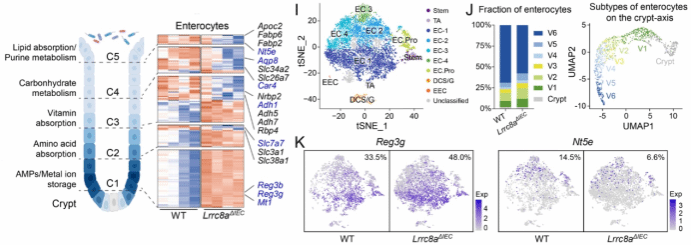 研究发现,在正常情况下VRAC缺失对肠上皮结构影响有限,但在炎症条件下,VRAC缺陷小鼠出现更严重的肠道损伤和炎症反应,并促进炎症相关结直肠癌的进展。进一步分析显示,VRAC缺失不影响干细胞的数量和谱系分化倾向,而是特异性地改变吸收型肠上皮细胞沿隐窝-肠腔轴的空间分布,使承担营养吸收功能的成熟细胞减少,而与抗菌防御相关的细胞比例增加,从而打破肠上皮细胞在代谢与防御两种功能之间的平衡。