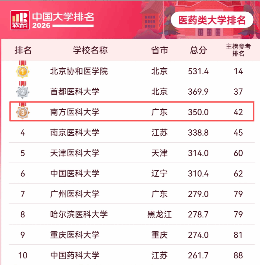 4月15日,软科中国大学排名正式发布。全国共有60所医药类高校入选2026年软科中国医药类大学榜单,我校蝉联第3位。