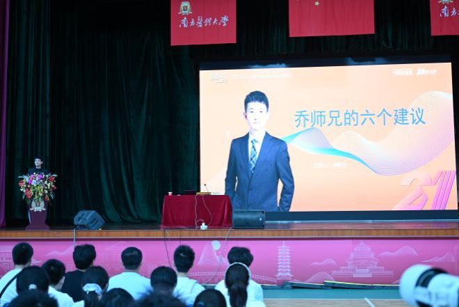 优秀校友代表乔泽平结合自己在校期间的学习与成长经历,向学弟学妹们提出了自己的建议;优秀在校生代表林福光分享了专业学习、社会实践及海外研学经历;两位榜样从不同维度为新生勾勒出大学生活的精彩蓝图与实现路径。