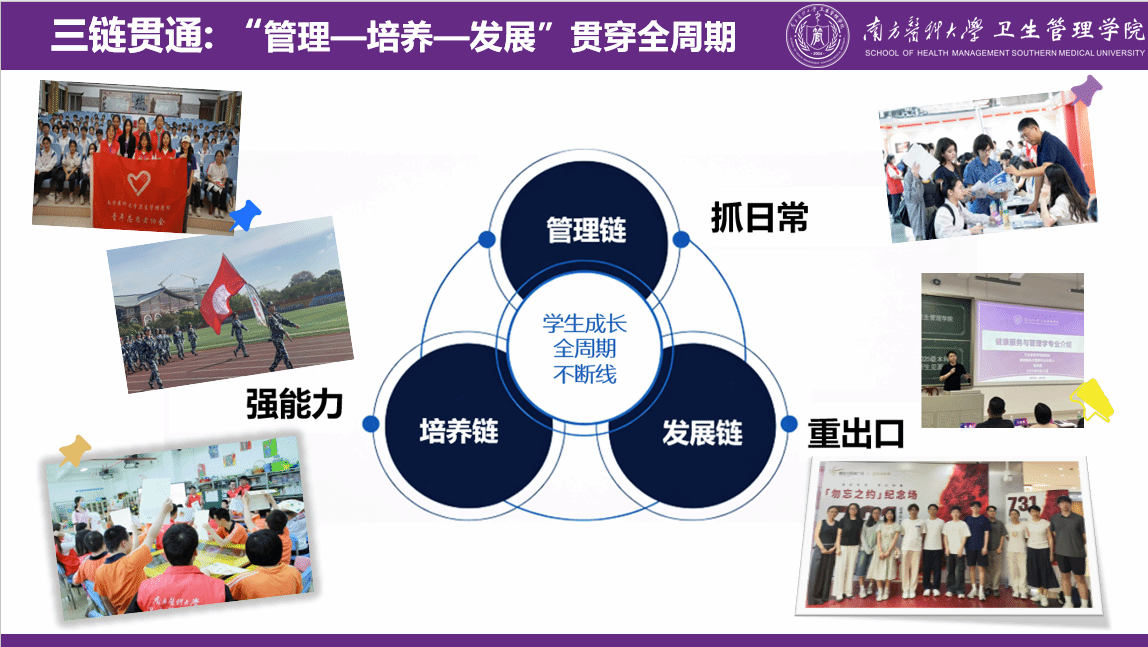 会议设学院工作经验交流环节。卫生管理学院围绕“抓住一个中心、聚焦两个抓手、夯实三链贯通、形成四维协同”,系统介绍学院学生工作体系。