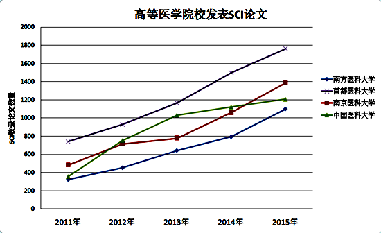 在全校科技工作者的辛勤付出下,我校科技论文发表取得了一定的成绩,然而全国各高等院校的SCI收录论文数也增长快速,首都医科大学SCI收录论文数1764篇;南京医科大学SCI收录论文数1387篇,都在我校SCI论文收录数量之上。我校在推进高水平大学建设的进程中,还需要全校教职员工进一步努力拼搏,奋发向上,促进更多高水平科技成果产出,提升学校学术水平和社会影响力。