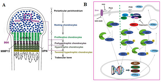 正常的软骨发生发育过程对于儿童四肢骨骼的发育、良好体形的维持具有重要作用。软骨发育进程受阻或异常,会导致软骨营养不良、软骨发育不全等儿童骨骼疾病的发生,多表现为躯体四肢比例失常的侏儒症。白晓春课题组发现雷帕霉素靶蛋白复合物1(mTORC1)的活性在软骨细胞分化发育过程中存在规律性动态变化,过度激活mTORC1通路能够促进软骨细胞增殖,抑制其肥大分化及终末分化,引起小鼠软骨发育不全;深入研究发现其分子机理是mTORC1通过改变其下游激酶S6K1活性,干预转录因子Gli2入核转录过程,激活其下游重要的软骨发育分子PTHrP的表达,最终影响软骨细胞的肥大分化进程(图1)。研究为软骨发育过程中细胞增殖与分化的协调机制提供新的观点,为临床使用雷帕霉素影响儿童骨骼发育提供理论解释。