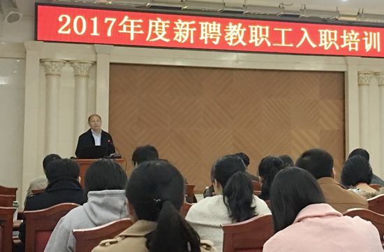 1月5日上午,春江厅里传出朗朗校歌声,由人事处组织、教学发展中心实施的2017年度新聘教职工入职培训开班。41名新聘教职员工将接受4天的集中培训。