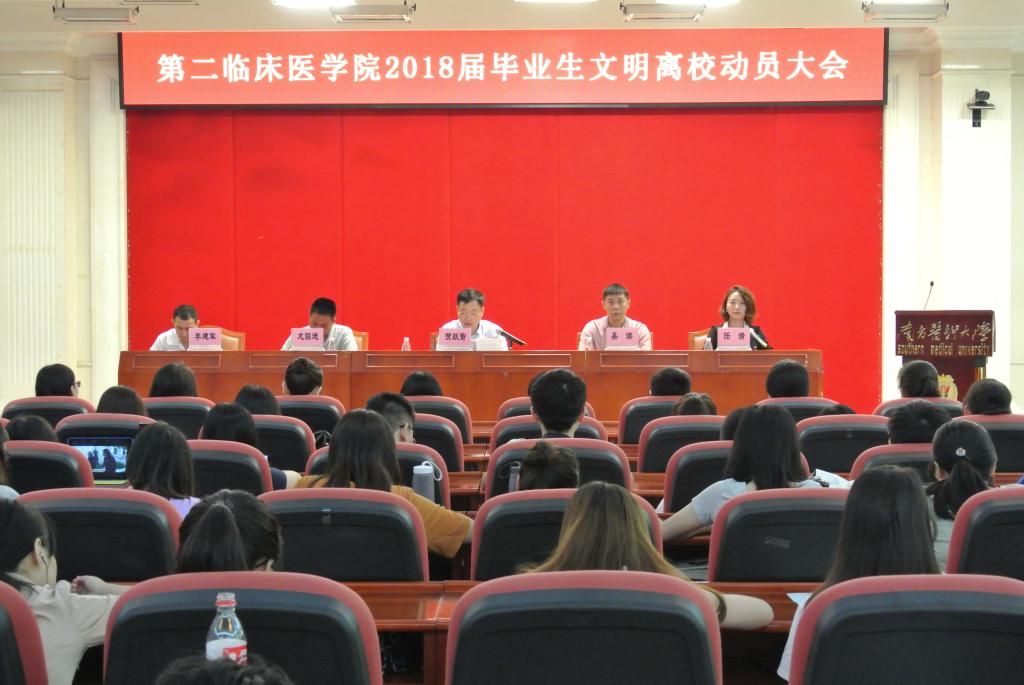 5月30日,第二临床医学院举行了毕业生文明离校动员大会,师生共同签署了文明离校倡议书。学院党委副书记贺跃箭,相关部门负责任、辅导员及全体毕业生参加了会议。