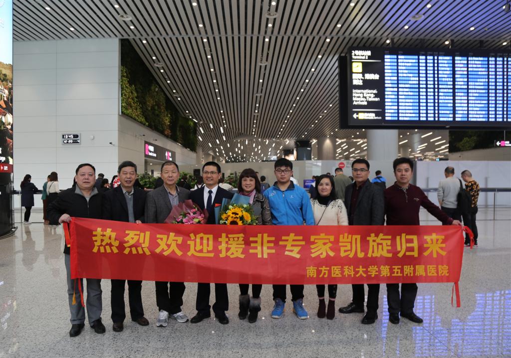 “出来啦,出来啦!”12月19日16时30分,在广州白云国际机场,当一名小女孩看到一名男子的身影从出口走出时,一下子拉着妈妈的手兴奋得跳跃起来。小女孩叫王蓝一,今年5岁,男子叫王阳,第五附属医院心血管内科二区的一名医生。自从王阳去年12月份离家到非洲国家——加纳执行医疗任务后,这是第一次回国,他跨越了13000公里、经历了15个小时的飞行,才终于回家了。