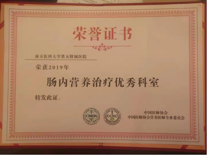 中国医师协会营养医师专业委员会2019年年会,于8月16日至18日在沈阳召开。五附院临床营养科荣获了广东省的“肠内营养先进科室”荣誉称号。本次是医院营养科获得的第一项国家级奖项。