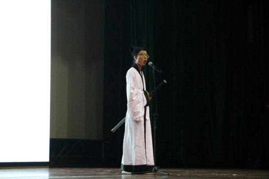 活动现场,为了让同学们深刻感受古人对于成年的思考,2018级学生薛良为新生们准备了特别的朗诵节目《少年中国说》。恢宏的音乐之中,薛良古装打扮,腰间佩戴着一把剑,在他雄厚的嗓音上,一篇文章悠然流出——少年强则国强,少年富则国富。