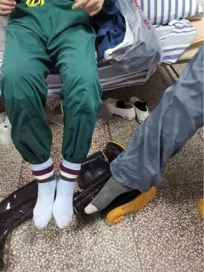 今天开始上白班,整个班非常忙碌,不停的接液体,还要做做病人的生活护理,比如倒尿、热饭、加水等,李桂林忙完所管2组,在间隙的时间来帮我们一起收拾病房垃圾!我脱下防护服时发现双腿已经被汗湿透了,其他同事也差不多,在第一批医疗队和本院医护老师创造的相对较好的工作环境下,我们第二批医疗队都忙成这样,可以想象到我们来之前他们有多辛苦,承受了多大的压力。