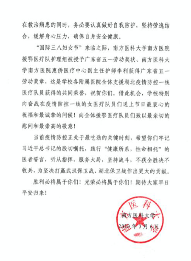 “国际三八妇女节”来临之际,南方医科大学南方医院援鄂医疗队护理组被授予广东省五一劳动奖状、南方医科大学南方医院惠侨医疗中心副主任护师李利获得广东省五一劳动奖章,这是学校各附属医院全体支援湖北疫情防控一线医疗队员获得的共同荣誉,祝贺你们。借此机会,学校特别向奋战在疫情防控一线的女医疗队员们送上节日最衷心的祝福和最诚挚的问候!向全体援鄂医疗队员们致以最亲切的慰问和最崇高的敬意!