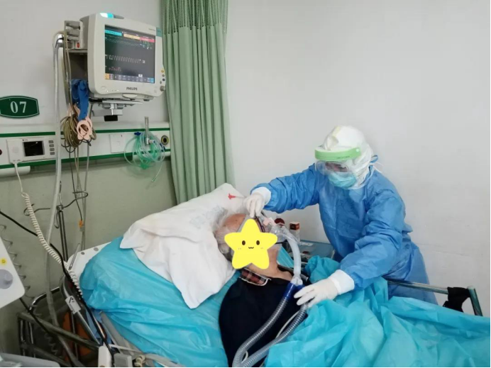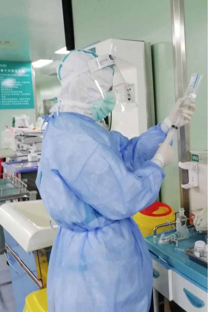 传染病区不能留家属和陪护,患者所有的操作均需我们护理人员去完成。我和我的搭档彭银帮老人清理干净,并且更换了干净的床单。由于老人不能自行移动,只能由一个人先把阿婆转向一侧,另一个人清理干净一侧后,接着再将老人转向另外一侧,如此翻转两次才能更换上新的床单位。