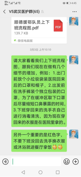 徐伟娟会同周姓良,与几个护理骨干先后牵头起草制定了《顺德援武汉医疗队护理工作职责》、《顺德援武汉医疗队护理院感防控工作职责》、《顺德援武汉医疗队护理记录书写规范》等一系列管理制度,使得护理工作顺利开展。