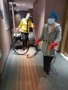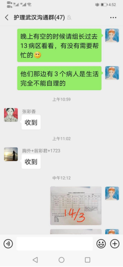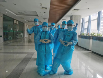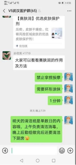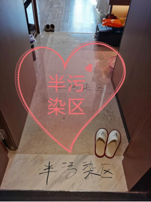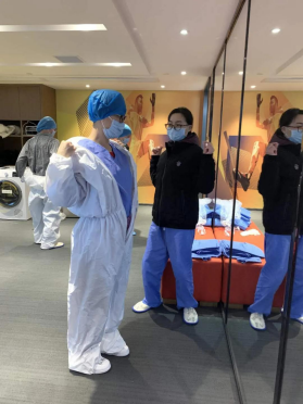 院感防控:包括防护知识的培训、考核,组织后续的反复练习,酒店的驻地管理和队员个人管理的指引,驻地的消毒防控顺序和个人房间的区域划分、进出顺序等。去病房监控队员的自我防护是否到位,病房的消毒处理是否合理。同时进病房与患者交流,指导患者自我情绪和的调节,给大家打气加油,同时指导患者家属的居家隔离措施等。