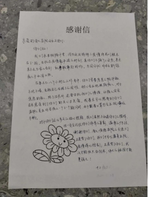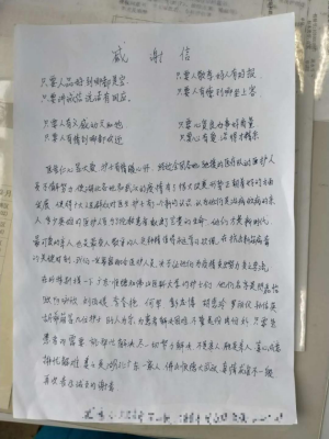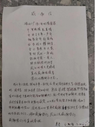 顺德医疗队的努力救治让这里的患者们看在眼里,记在心上。其中有一位进来时是重症的患者,经过治疗以后好转的大叔,连续多天每天给我们写一封感谢信,徐伟娟说:“我曾打趣的问大爷,是不是为了练字?”大叔他对我举起了大拇指,说”感谢我们对他们的帮助,真心感谢!”