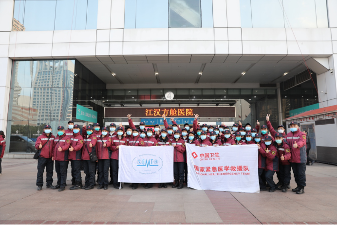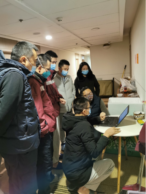 2月5日,行动开始的第一天,我们受命接手改造三家“方舱医院”的其中一家,即“江汉方舱医院”(位于武汉江汉区武汉国际会展中心)。当晚10点“江汉方舱医院”将正式开始接收病人。由于天气寒冷、又要高频数、长时间接触大量病患,随时有职业暴露的风险,我们其中一部分队员自愿肌注了增强抵抗力的药物(虽然有一定的副作用)。随后,我们去现场熟悉了场地,看了消毒、穿脱隔离服的路径、医院各个设施的分布,并集中开了个小会。还记得我们当时问队长“我们几小时一个班?”,队长回答“暂时不知道”,我们问“我们负责多少患者?”、“有齐全的防护用品吗?”、“方舱医院有足够的卫生条件让我们回来前彻底消毒吗?”,队长也只能回答“暂时不知道”。但是他告诉我们:“我们是应急队,现在考验的就是应急能力!一切我们就在摸索中前进。所以,第一批队员我们要经验最丰富的林医生、赖医生去,随机应变,回来告诉我们,我们也好及时做应变和调整”。在江汉方舱医院门口,我们最后聚在一起喊着“武汉加油!”,因为我们约定即便是同一个队的队员,之后我们也将各自隔离,避免交叉感染。