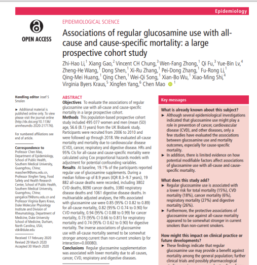 近日,由我校公共卫生学院流行病学系毛琛和食物安全与健康研究中心杨杏芬,联合杜克大学医学院风湿免疫学专家Virginia Byers Kraus教授领衔的国际合作研究团队在国际知名医学期刊《Annals of The Rheumatic Diseases》(IF = 14.299,风湿小类原创性期刊排名第一)在线发表了最新研究成果,揭示了葡萄糖胺(Glucosamine)在中老年人群的健康效应,论文题为“Associations of regular glucosamine use with all-cause and cause-specific mortality: a large prospective cohort study”,毛琛、杨杏芬和Virginia Byers Kraus为共同通讯作者,2018级博士研究生李志浩为第一作者。中国疾病预防控制中心环境所所长施小明研究员、美国宾夕法尼亚州立大学高翔、香港中文大学钟志豪等作为共同作者为本研究做出了重要贡献。