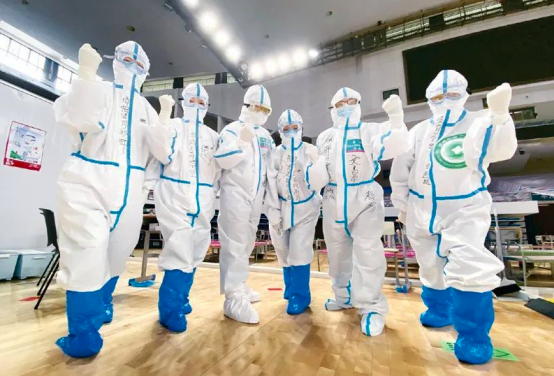 2020年3月10日,武昌方舱医院休舱。待全部患者出舱后,几名护士拍照合影,为武汉加油。