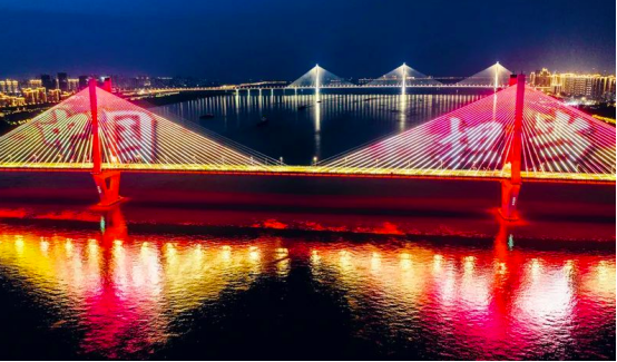 在抗击新冠肺炎疫情的斗争中,中国人民万众一心、众志成城,凝聚起强大合力,展现了中国力量、中国精神、中国效率。图为2020年5月2日晚,湖北武汉长江二桥灯光秀打出的“中国担当”画面