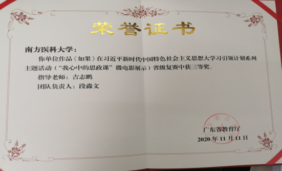 近日获悉,我校师生在习近平新时代中国特色社会主义思想大学习引领计划系列主题活动——“我心中的思政课”微电影省级复赛中喜得佳绩。马克思主义学院教授傅义强指导的微电影作品《南医梦》,副教授吉志鹏指导的微电影作品《如果》,分别荣获习近平新时代中国特色社会主义思想大学习引领计划系列主题活动——“我心中的思政课”微电影展示省级复赛二等奖、三等奖。