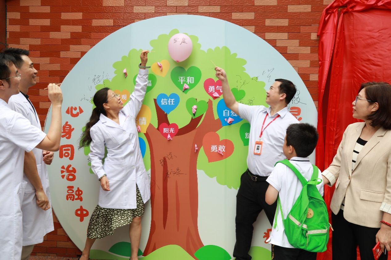 仪式现场,领导和专家一起在心灵树上签名,寓意着中西医携手同心,共同护航精神心理健康。