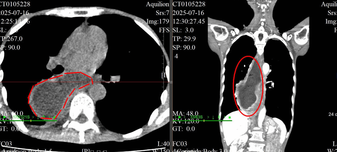 CT水平面和冠状面显示,老伯的食管严重扩张,形成了巨大的憩室,已经不是正常的“管状”了。