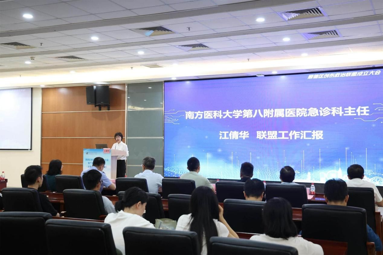 医院急诊科主任江倩华汇报了顺德区创伤救治联盟的建设工作。她介绍,顺德区创伤救治联盟将发挥教学科研优势,培养本土化创伤救治人才,推动全区创伤救治同质化发展。同时,联盟将推广创伤救治新模式、重症床旁超声等实用技术,通过‘技术下沉、患者上转’的双向机制,让每一位创伤患者都能享受到高效精准的救治服务,为更多严重创伤患者带来“生”的希望。