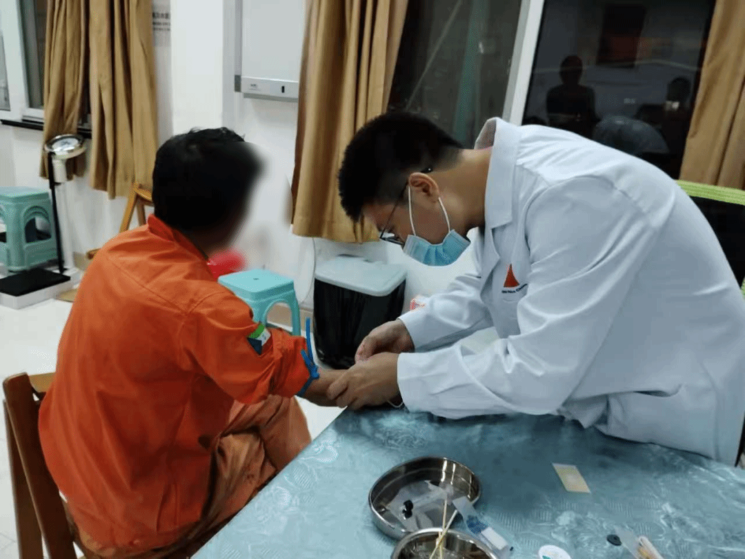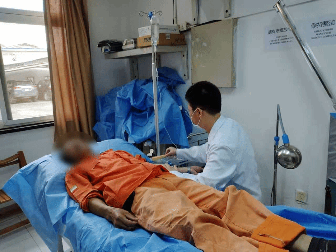 九月的一个上午,我在马拉博驻地接诊了一名重症患者。当时他在几位工友的搀扶下,跌跌撞撞地来到中国医疗队的马拉博驻地门诊求医。这位患者当时的情况十分危急,整个人虚弱得几乎无法独立行走。我刚好在门诊整理门诊用物,见状当即放下手头工作,进行接诊通过细致耐心的问诊。