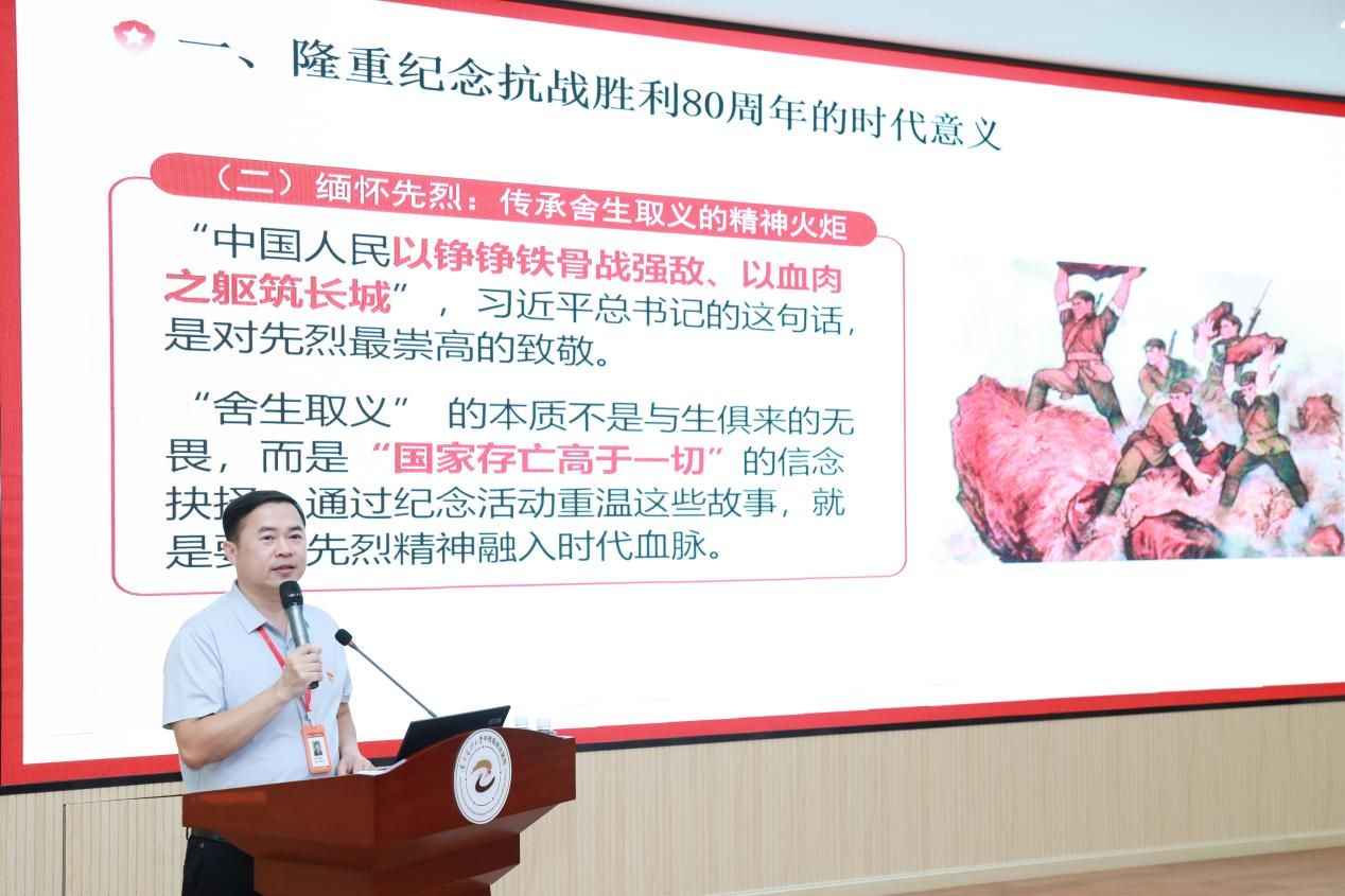 陈旭坚围绕“历史回响与时代召唤”“烽火岁月——抗战中的医者仁心与民族脊梁”“使命在肩——新时代医学生的责任与担当”三个部分展开讲授。他紧扣中国人民抗日战争胜利80周年的时代背景,循着“铭记历史、缅怀先烈、珍爱和平、开创未来”四个维度,结合赵一曼留遗书明志、杨靖宇严寒中坚守等先烈事迹,阐释了抗战精神“天下兴亡、匹夫有责的爱国情怀,视死如归、宁死不屈的民族气节,不畏强暴、血战到底的英雄气概,百折不挠、坚韧不拔的必胜信念”这一核心内涵。