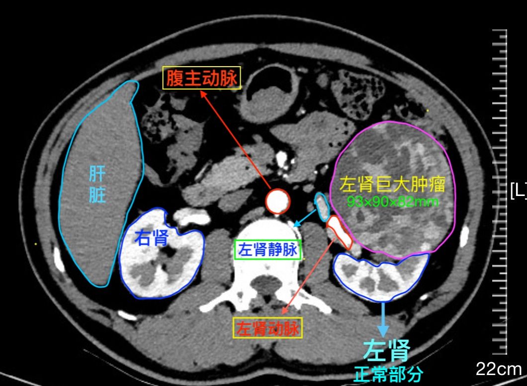 (术前CT影像清晰显示左肾巨大肿瘤,如一颗“定时炸弹”)