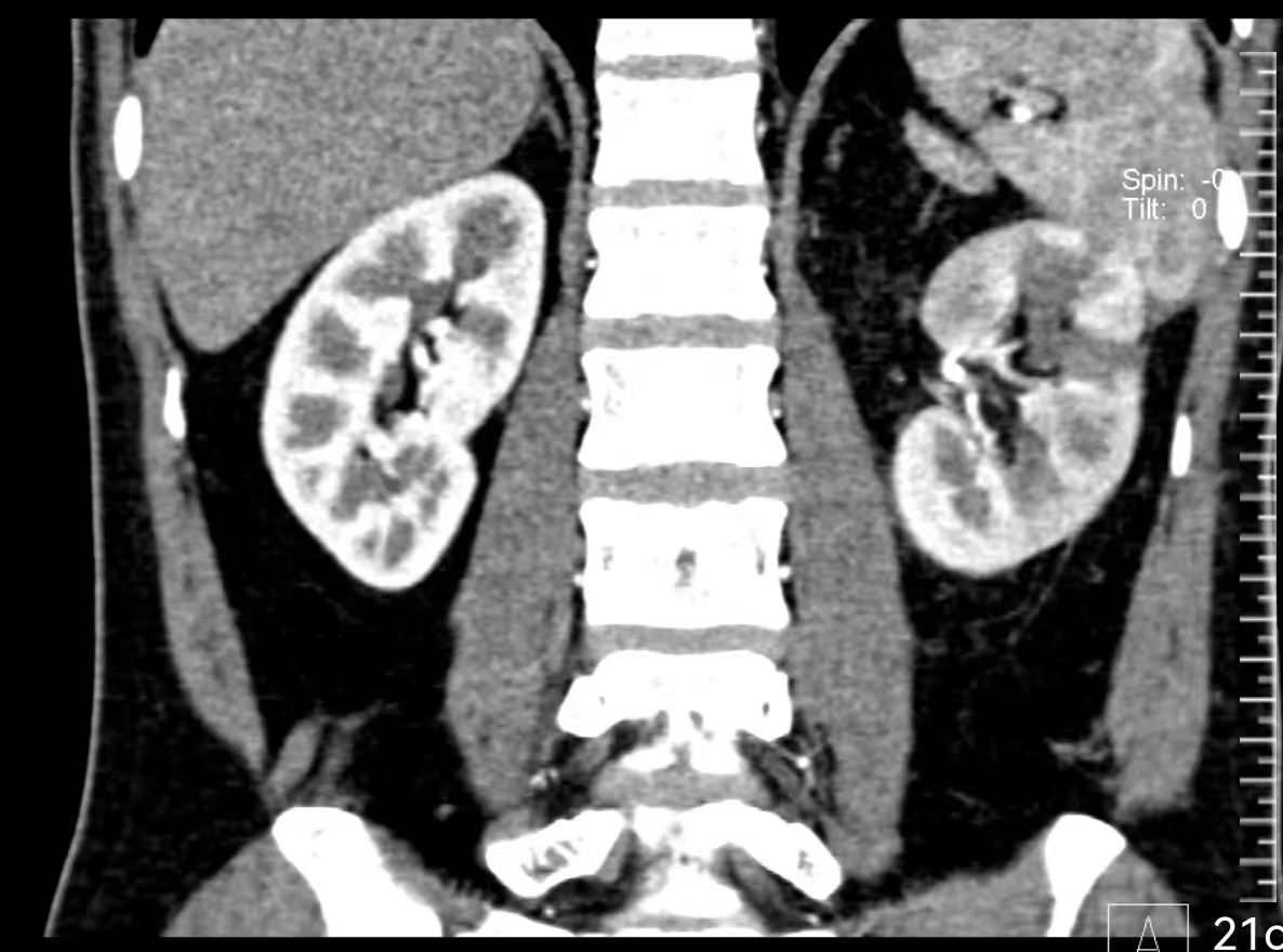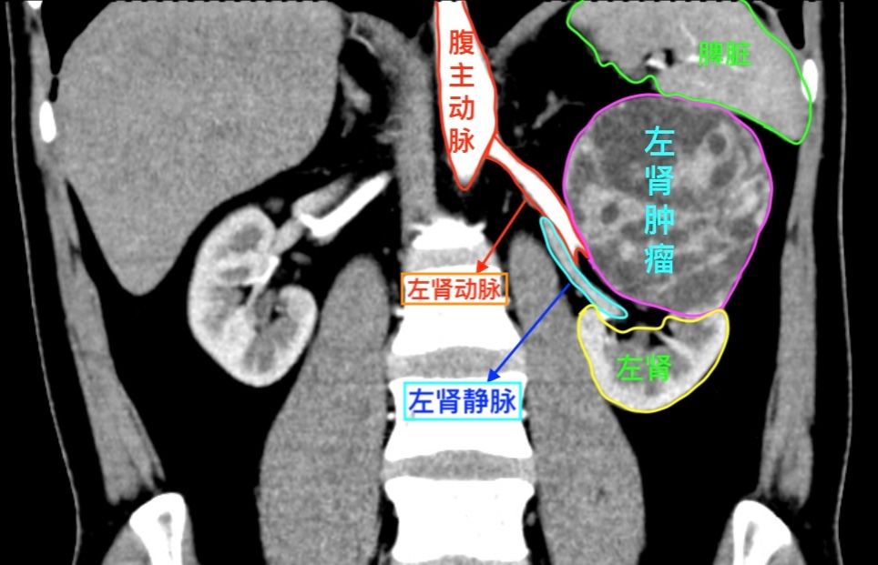 (冠状位影像更完整地展现了肿瘤与肾脏的毗邻关系)
