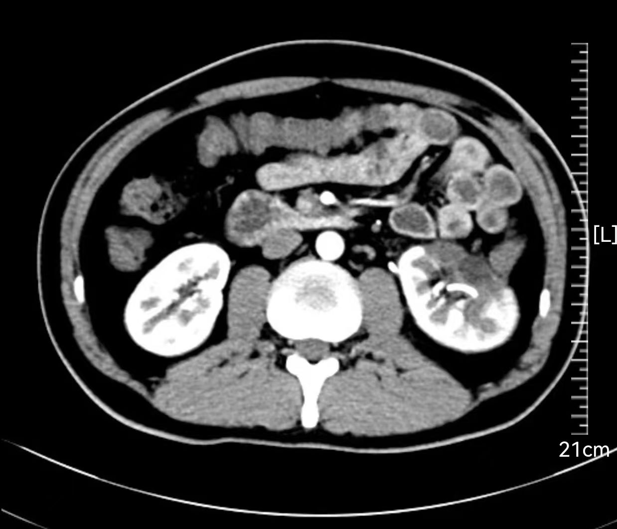 患者文先生在一次常规体检中,意外发现左肾存在一个巨大占位。进一步的增强CT检查结果令人倒吸一口凉气:一个大小约93×82×90mm的类圆形肿瘤从肾脏突出,位置极其凶险,紧贴着肾门部的大血管和集合系统。经专业评估,该肿瘤R.E.N.A.L评分高达11分,属于“高度复杂”级别。