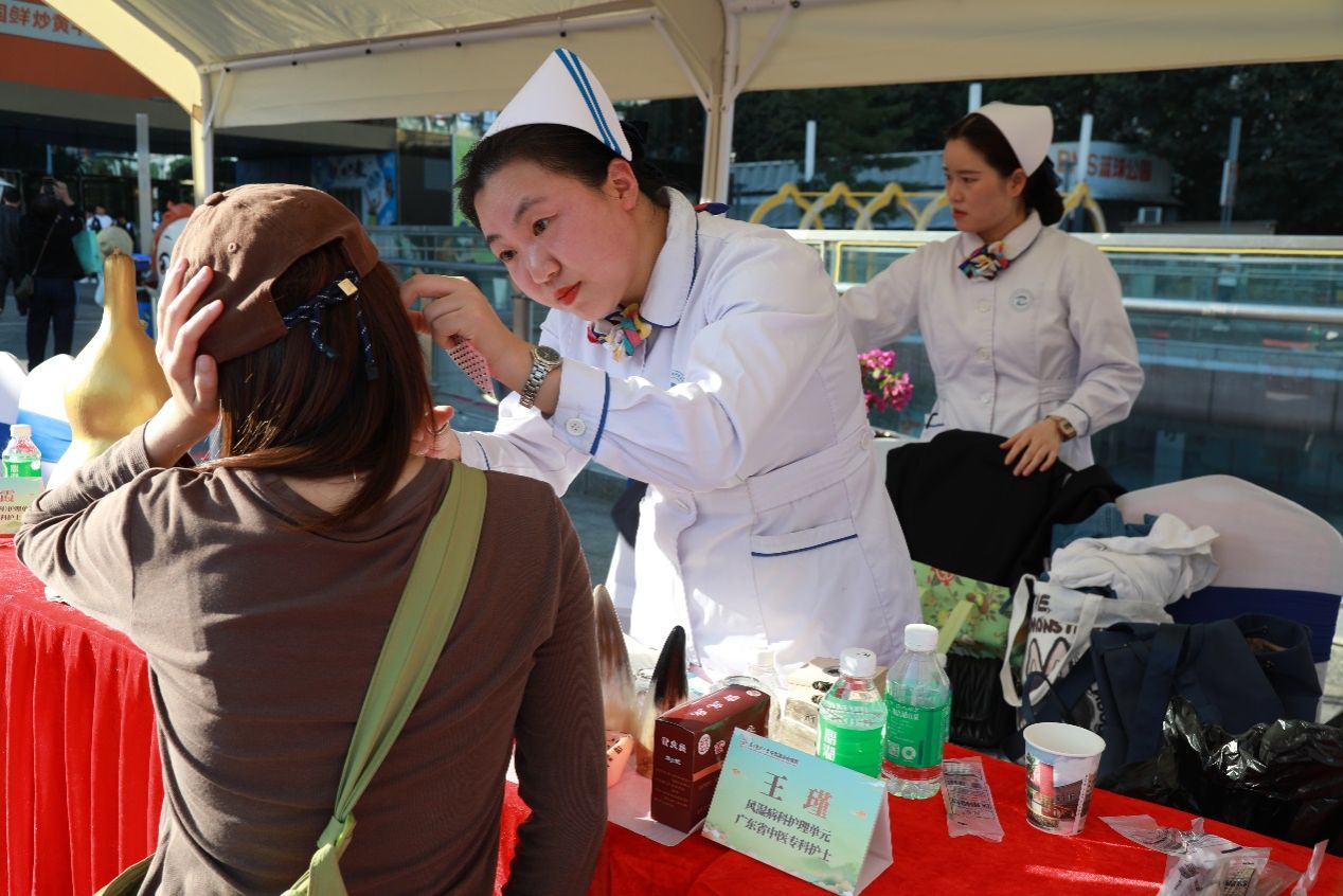 中医特色疗法体验区前人气爆棚,护理团队现场给市民朋友们带来耳穴压豆、艾灸等多项中医护理适宜技术。市民张先生因工作久坐常有肩颈酸痛,护理人员为其辨证后,选取对应耳部穴位贴压王不留行籽,同时指导日常按压技巧,“按压后酸胀感很明显,肩颈瞬间舒展了不少”,张先生对这种无创又实用的疗法连连称赞。