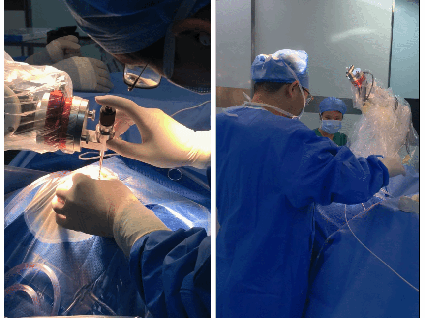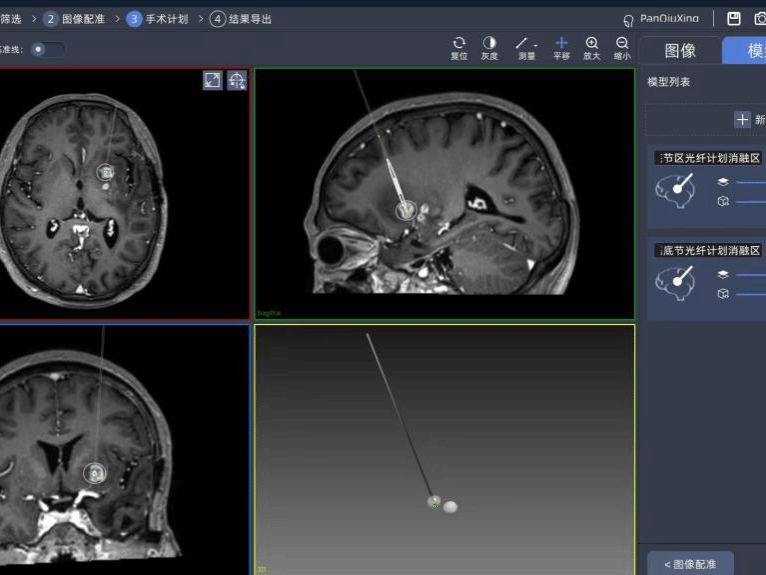 术前,孙新林教授团队利用多模态影像规划软件,精确设计穿刺路径和消融范围;术中,在机器人辅助下将光纤沿着预设的“安全通道”,精准置入大脑深处的病灶靶点,并在MRI实时监控下10分钟完成激光消融。