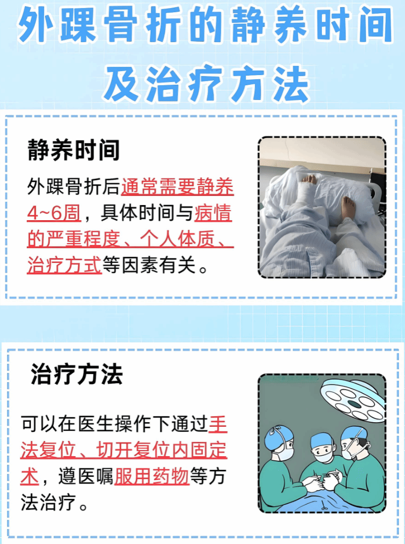 医生介绍,两种骨折的治疗原则虽有共性,但细节不同。外踝撕脱性骨折的治疗,视骨折块大小和移位程度,进行保守治疗或手术治疗。该病例中小王的外踝撕脱骨片小、移位仅2mm,选择“U型石膏或踝关节支具外固定”4 - 6周,固定时保持踝关节中立位(避免内翻或外翻)。