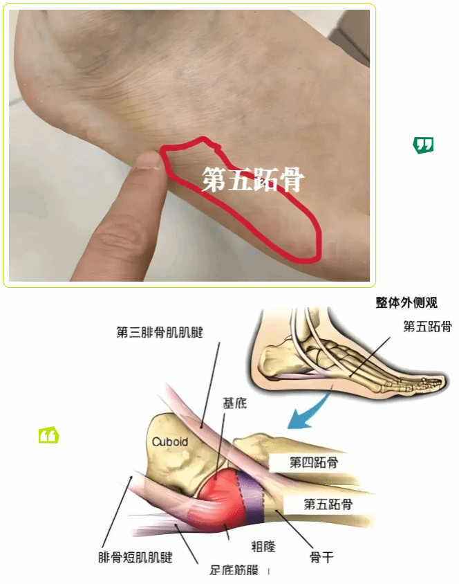 第五跖骨基底部骨折痛点在足背外侧中部(即脚外侧从脚趾往上数的“第一个鼓包”处),按压第五跖骨基底部时疼痛剧烈,足趾向内侧收缩(如试图用脚尖画圈)时疼痛加重,踝关节活动时疼痛相对较轻。