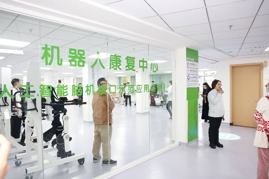 与会人员参观了医院机器人康复中心(人工智能脑机接口示范应用场景),重点了解医院在运动功能评估、神经调控及智能康复等方面的建设成效。作为当天参观过程中最受关注、体验感最强的核心区域,集中展示医体融合从理念走向可操作、可复制实践的落地成果。
