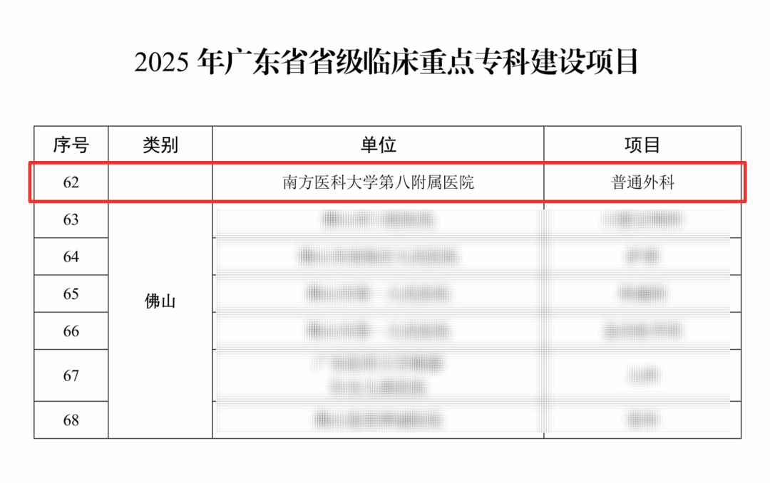 近日,第八附属医院普通外科入选2025年广东省省级临床重点专科建设项目名单,至此,医院“十四五”期间已有心血管内科、呼吸内科、神经外科、内分泌科、麻醉科和普通外科共六个省级临床重点专科建设项目。