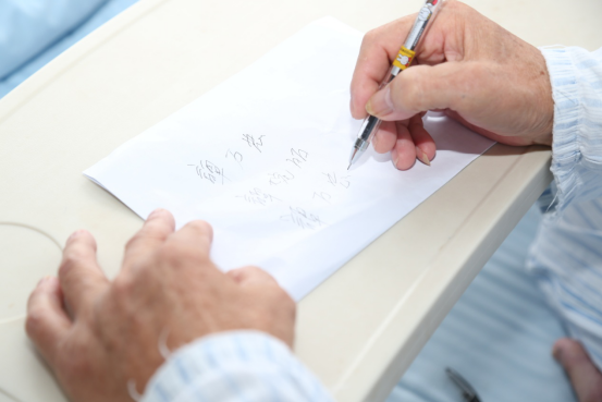 8月7日,在女儿婉丽的陪同下谭伯到中西医结合医院进行康复治疗,10天后出院时谭伯告诉我们自己现在喝水不怎么呛了,说话时嘴巴可以张得更大了,手脚比以前有力气了,还现场书写了女儿和自己的名字。