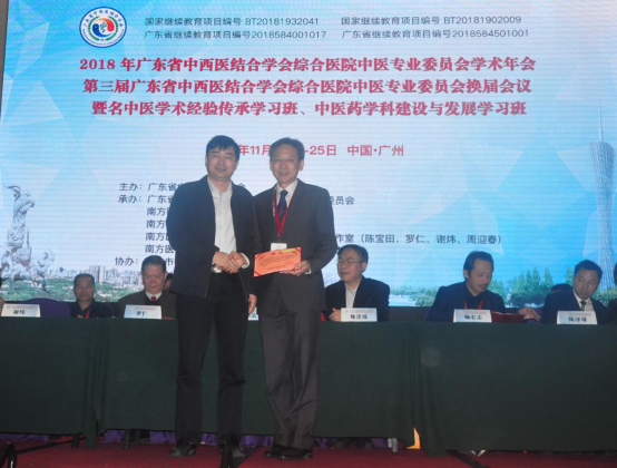 11月23日-25日,由广东省中西医结合学会主办,南方医院、中西医结合医院名中医传承工作室(陈宝田、罗仁、谢炜、周迎春)、中医药学院等承办的广东省中西医结合学会综合医院中医专业委员会2018年学术年会暨换届会议以及名中医学术经验传承学习班、中医药学科建设与发展学习班召开。
