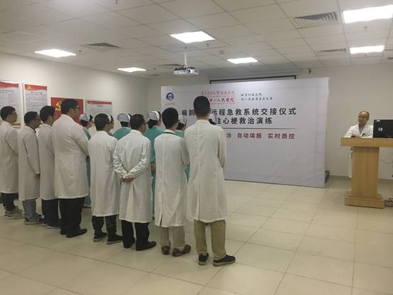 出席系统交付仪式的院领导、心脏医学中心学科带头人、医院副院长胡允兆介绍,急性心梗等多种致命性心脑血管疾病,发病快,死亡率高,发病初期的120分钟是救治的黄金时间。在传统急救医疗条件下,由于缺乏有效的技术手段衔接院前急救与院内抢救,120急救人员救治这类高危患者时,没有有效的监护和指导,当患者被转送到医院后,还需要在急诊科做各种检测,然后转至心内科,再到手术室才能接受手术,这种运行机制耽误很多时间,对于急危重病人,极有可能失去救治的黄金时间。“扁鹊飞救”系统的建立,实现在现场抢救或运转途中及时明确诊断,需要手术的,可提前启动手术室,无需入院后再做相应检查,就直接将患者送达手术室抢救,缩短抢救时间至少在30分钟以上,最大限度地提高抢救成功率,降低死亡率和伤残率。