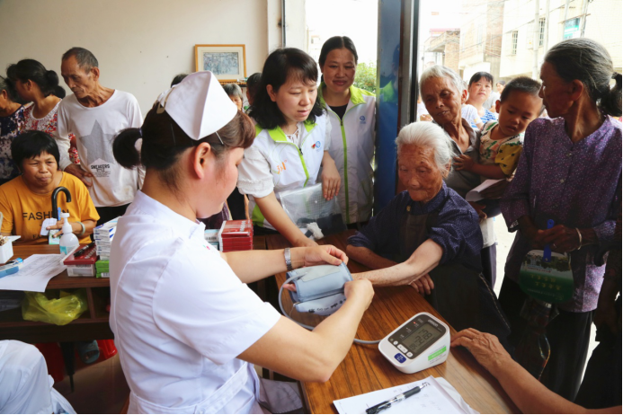 当天上午,老年科、神经内科、心血管内科、妇产科、儿科、创伤骨科、脊柱外科、眼科、内分泌科、院感科等多个学科组成的医疗团队现场为村民检查身体,提供常见病、慢性病健康咨询服务,对疑难、复杂疾病的村民给予初步筛查、诊断,提出治疗建议,同时医务人员还免费为村民进行血压、血糖的测量,并进行了《老年人健康常识及预防》和《优生优育》健康宣传培训课,为他们发放健康手册,宣传健康知识,倡导健康生活。由于大部分前来义诊的村民为中老年人,听力有些障碍,每位医务人员都耐心细致的逐一解答他们提出的各类问题,让村民深受感动。