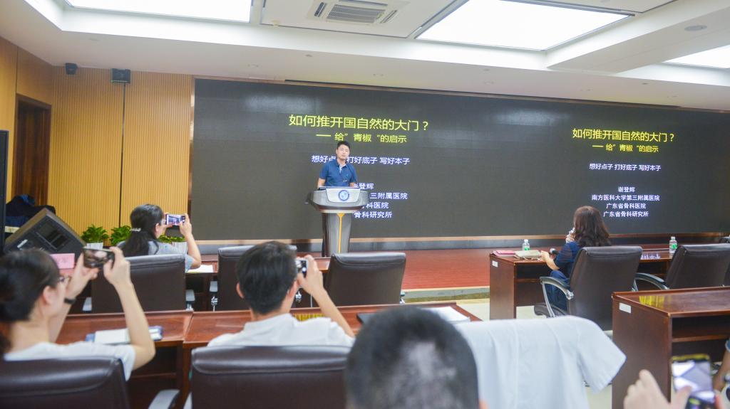 讲座由副院长张群主持,关节外科青年专家谢登辉以《如何推开国自然的大门?--‘青椒’的启示》为题,为医院青年科研骨干进行了项目申报工作的专题讲座。