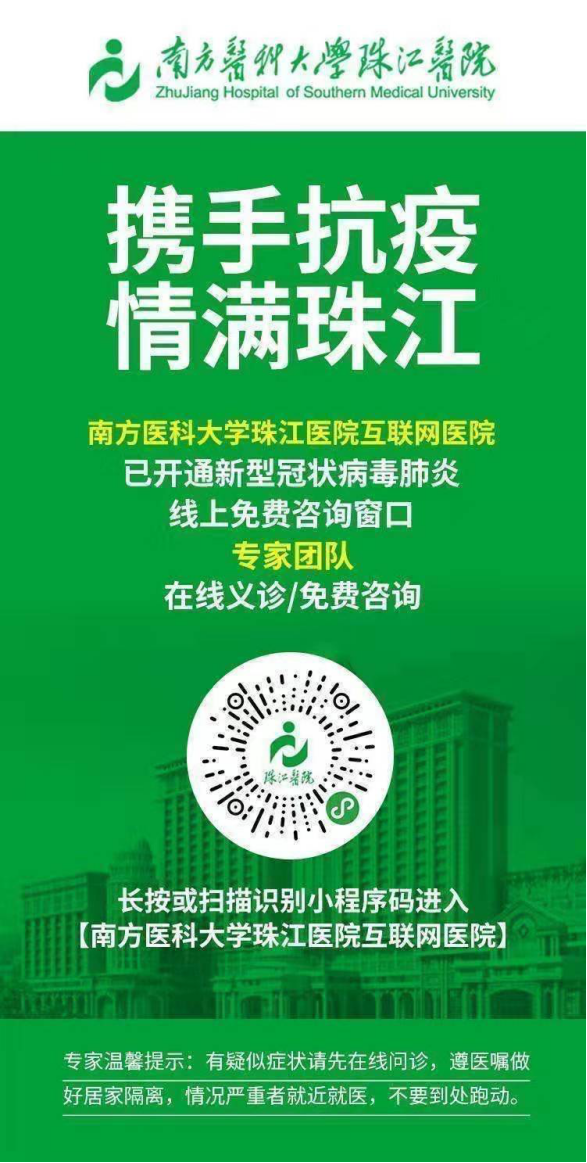 为积极防控新型冠状病毒感染的肺炎疫情,增强群众自我防范意识,同时有效减少来医院就诊的人群接触传播风险,珠江医院29日开通了互联网医院“新型冠状病毒感染肺炎”防控线上免费咨询端口。医院从相关临床科室挑选出临床一线骨干医师组成新冠状病毒感染肺炎咨询团队,上午8点正式上线为广大市民服务。