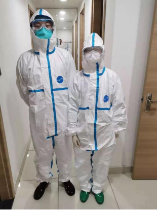 所谓无所不能的防护服,大部分人从来都没见过,这也是我真正第一次穿。从头到脚,有N95口罩,帽子,眼罩,防护服,水靴,两层手套,穿完一整套下来,有点感觉呼吸不过来,动作也变得很沉重。然而我们穿完这套防护服后是要深入病房的,我们的工作包括病人的各种治疗、护理,还有病房的清洁消毒以及垃圾的打包。看起来一天的工作量不大,但是当你穿上防护服之后就完全不一样的体会。
