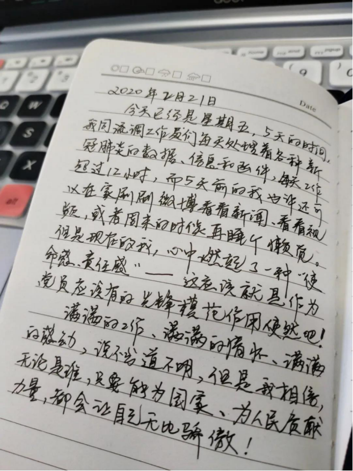 5天的时间转瞬即逝,我同流调工作人员们每天处理着各种新冠肺炎的数据、信息和函件,一天工作超过12小时,而5天前的我也许还可以在家刷刷微博看看新闻、看看视频,或者周末的时候再睡个懒觉。但是现在的我,已然没有前些日子的倦怠和悠闲,投入工作后,心中燃起了一种 “使命感、责任感”—这应该就是作为党员应该有的先锋模范作用使然吧!满满的工作、满满的情怀、满满的动力,说不出道不明,但是我相信,无论是谁,只要能为国家、为人民贡献力量,都会让自己无比骄傲!