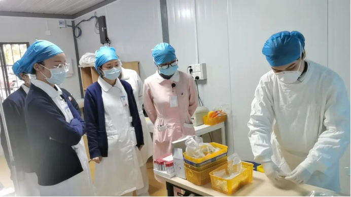 从第一道防线预检分诊、新建的普通发热门诊就诊处,高风险操作的咽拭子采集处及隔离病区,接着到各临床科室,护理部全员严密督导各护理单元,把好每一个关口,严防每一处涉及到的护理环节;及时应对各类突发事件,全力保障抗疫一线和临床护理工作的有条不紊。